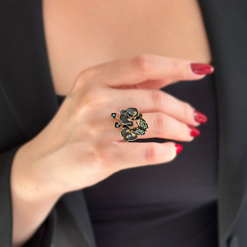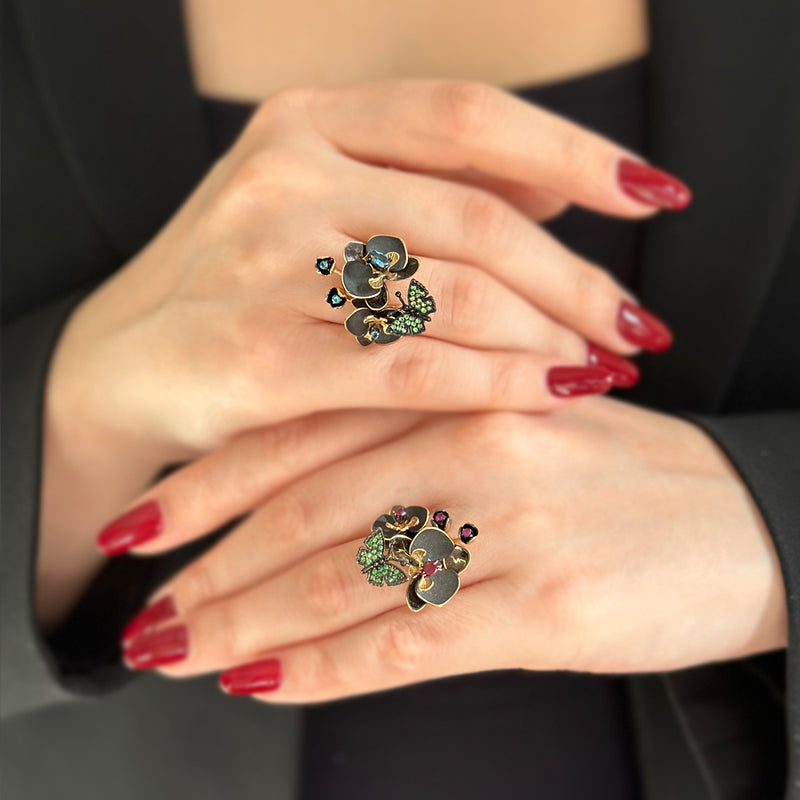 Black Orchid London Blue ve Zümrüt Taşlı Oksideli Yüzük